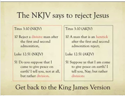 Jesus was and continues to be a divisive man, but He was not a heretic. The King James Bible tells us to avoid heretics. The modern versions, including the NKJV, tell us to avoid and have nothing to do with a divisive man, and, if we follow the logic of simple words, this would include Jesus!