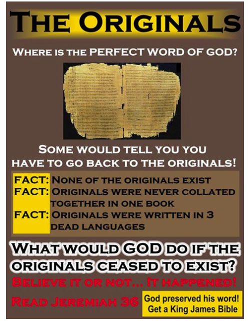 IF you are an “originals only” type of Christian who believes that ONLY the originals ARE/were inspired and inerrant, and that “No translation is perfect”, then just say so. Be honest about it. But don’t stand in the pulpit or write on your blog things like “We believe the Bible IS the inerrant words of God”, when you have no such Bible anywhere in print to give to anyone, and you know you don’t. STOP LYING ABOUT IT!
