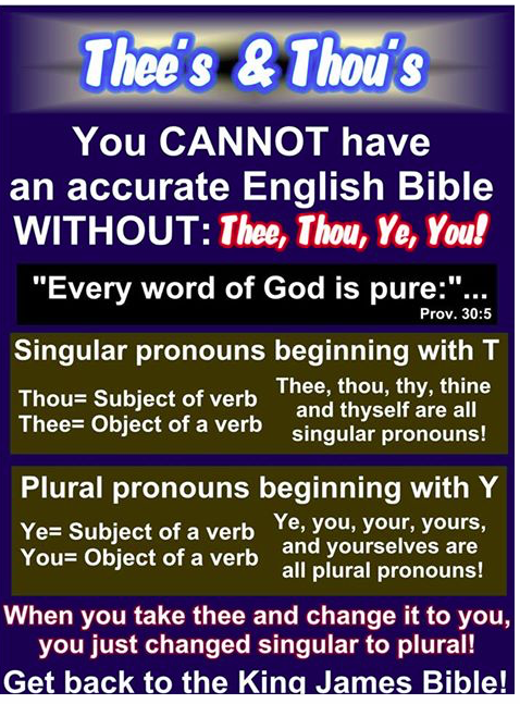 However the continued use of words like "thee, thy, thine and thou" to refer to one person and "you, your and ye" to refer to many people is far more accurate to the underlying Hebrew and Greek that is the generic "you". This important distinction is ALWAYS maintained and never mixed in the written text of the King James Holy Bible.